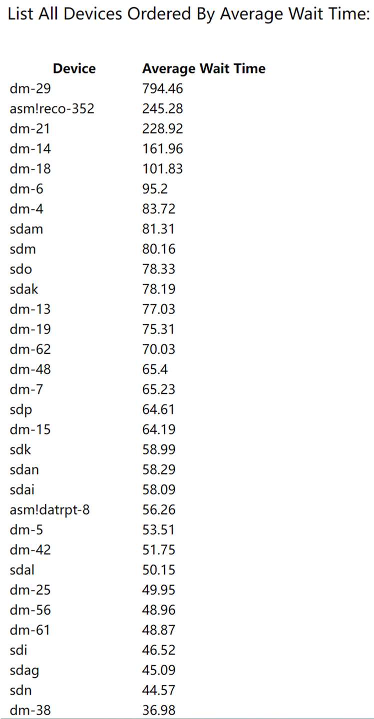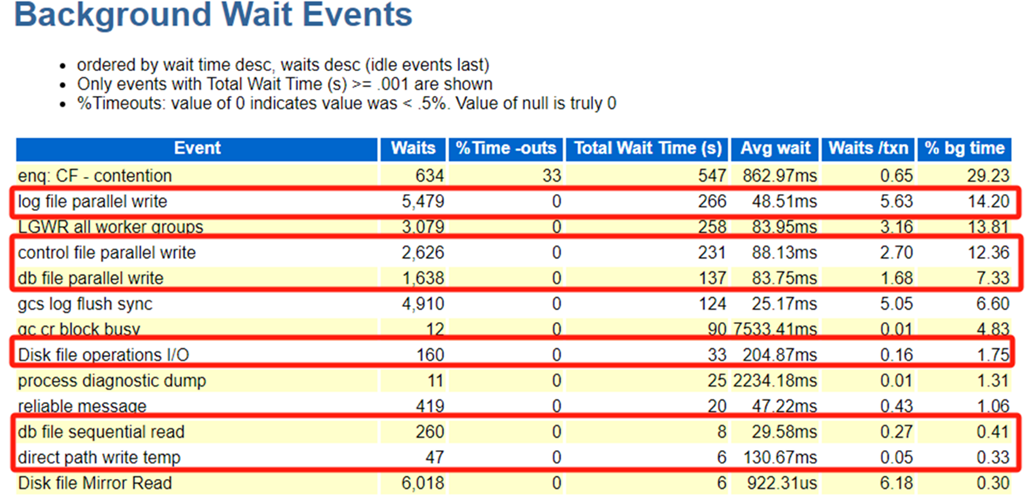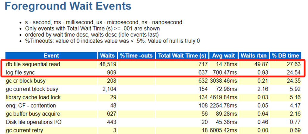 从故障时间前的awr报告可以看出,数据库持续存在磁盘性能问题,换句话说:磁盘IO性能很差。正常磁盘平均等待应该在1-2ms,而报告显示IO类的平均等待有大几百毫秒。至此,故障脉络清晰,原因明了。