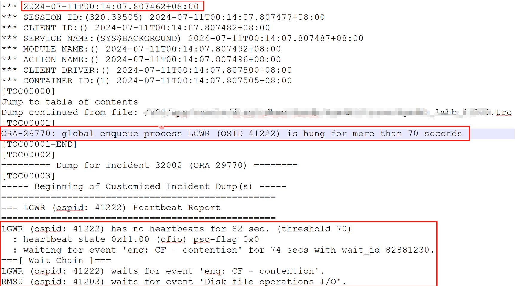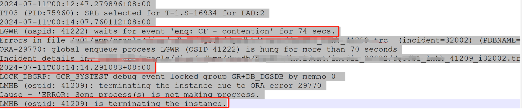 某交易型数据库1节点与7月11号00:14:14左右发生实例重启,经查看故障时间点LGWR进程被阻塞74秒,在等待"enq:CF - contention",随后LMHB进程将数据库实例终止。00:48:20实例启动成功