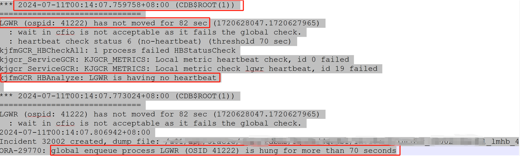 Trace日志显示LMHB进程检测到LGWR进程82秒无响应,状态为无心跳。