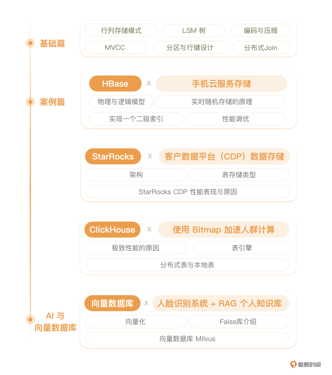 这个专栏继承了彭老师一贯的教学风格,内容由浅入深,全面讲解数据库的通用核心原理,并拆解主流数据库的应用案例,提供选型建议。此外,还深入探讨了当前热门的向量数据库,整个学习过程不仅让人对分布式数据库有了全面深刻的理解,还能结合实际情况进行数据库选型,有效解决实际问题,并且能够洞察 AI 时代数据库技术的发展趋势。