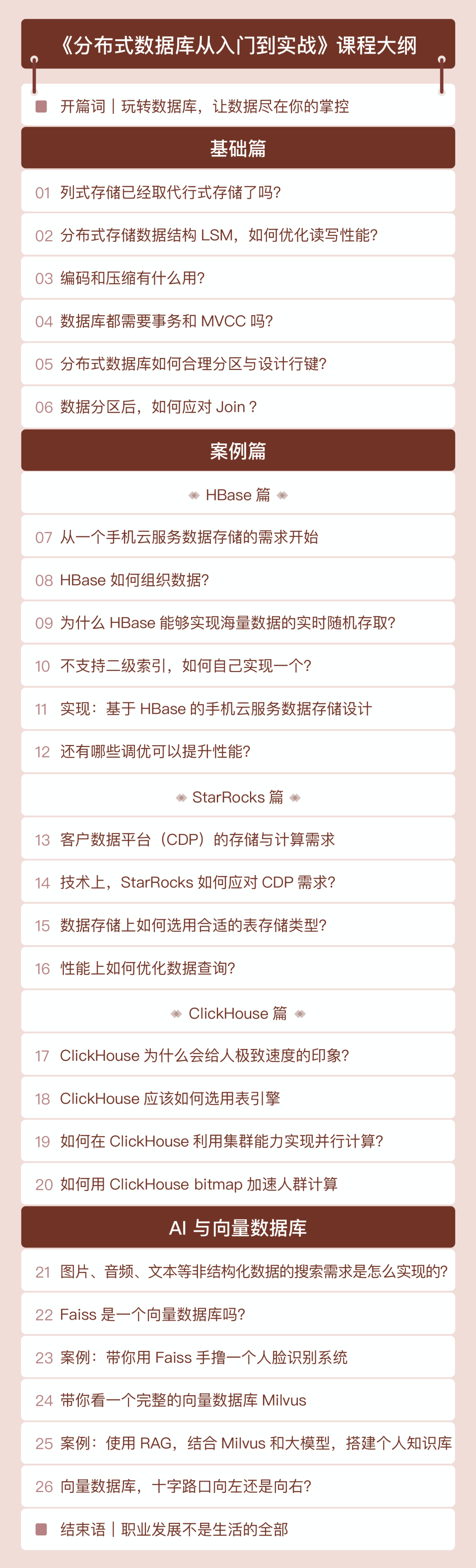 《分布式数据库从入门到实战》这个课程整体上分成3大部分,是一个由普适性向特殊性的学习过程,包括基础篇、3个案例篇和AI与向量数据库篇。学好这些,你将不仅仅对分布式数据库有一个较为全面的认知,更能聚焦业务需求的细节之处,大到运维成本控制策略,小到解决一个死锁报错,统统都能在这里找到答案。