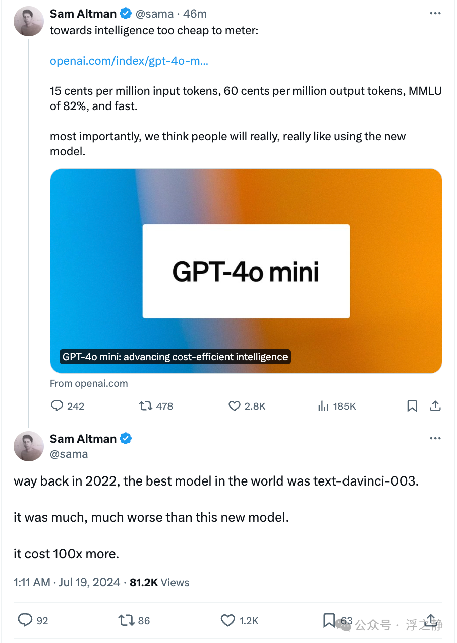📌在 2022 年,世界上最好的模型是 text-davinci-003。它比 GPT-4o mini 差很多,其成本是 GPT-4o mini 的 100 倍。