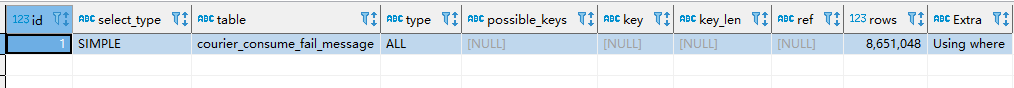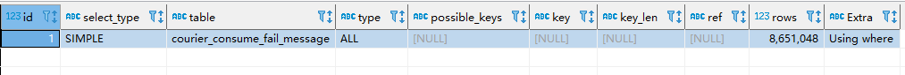 在我们的生产环境中有一张表:courier_consume_fail_message,是存放消息消费失败的数据的,设计之初,这张表的数据量评估在万级别以下,因此没有建立索引。