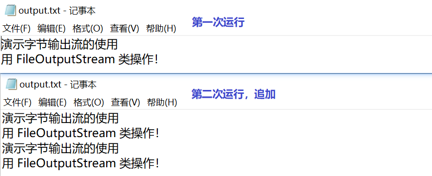 我们来看一个例子,把“演示字节输出流的使用\r\n用 FileOutputStream 类操作!”的文本输出到 D:/file/txt/output.txt 文件中。