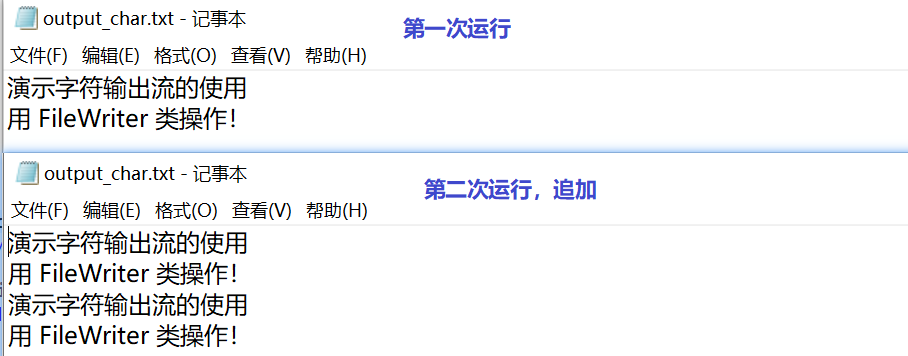 我们来看一个例子,把“演示字符输出流的使用\r\n用 FileWriter 类操作!”的文本输出到 D:/file/txt/output_char.txt 文件中。