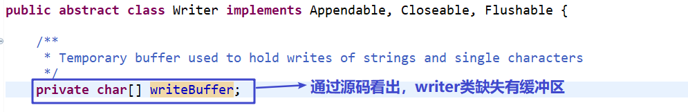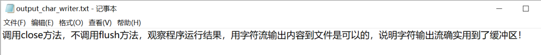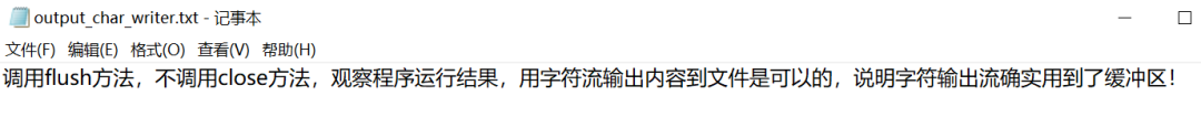 /*** 调用close方法,不调用flush方法,观察程序运行结果,用字符流输出内容到文件是可以的,说明字符输出流确实用到了缓冲区*/@Testpublic void testWriter3() throws IOException {// 1、使用File类与文件建立联系File file = new File("D:/file/txt/output_char_writer.txt");// 2、选择对应的输入流或者输出流Writer writer = new FileWriter(file);String info = "调用close方法,不调用flush方法,观察程序运行结果,用字符流输出内容到文件是可以的,说明字符输出流确实用到了缓冲区!\r\n";// 3、进行写操作writer.write(info);// 4、关闭资源writer.close();}