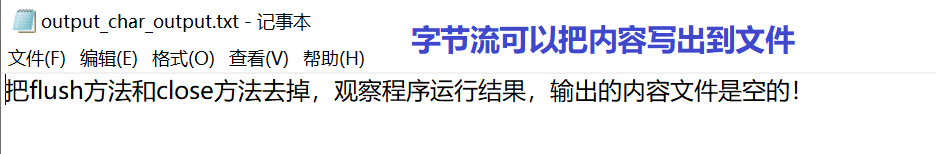 /*** 把flush方法和close方法去掉,观察程序运行结果,用字节流可以输出内容到文件*/@Testpublic void testOutput1() throws IOException {// 1、使用File类与文件建立联系File file = new File("D:/file/txt/output_char_output.txt");// 2、选择对应的输入流或者输出流OutputStream os = new FileOutputStream(file, true);// 3、进行写操作String info = "把flush方法和close方法去掉,观察程序运行结果,输出的内容文件是空的!\r\n";byte[] b = info.getBytes();// 字符串转字节数组os.write(b, 0, b.length);// 写出}