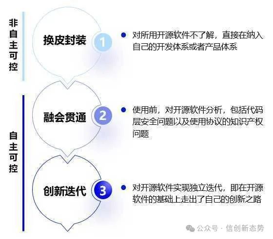但使用开源软件≠不安全,厂商对开源软件的使用情况可以分为三个阶段:封装换皮阶段、融会贯通阶段、创新迭代阶段,很多人的认知停留在第一阶段,造成了对开源软件的安全担忧。