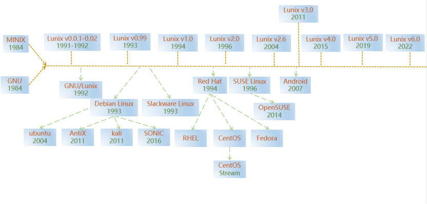Linux在服务器领域的应用最为广泛,各大硬件厂商也相继支持Linux操作系统;同时,大型、超大型互联网企业都在使用Linux系统作为其服务器端的程序运行平台,Linux已经逐步渗透到了各个行业领域,以下为主流Linux操作系统演进过程。