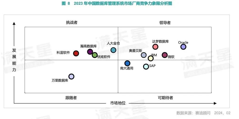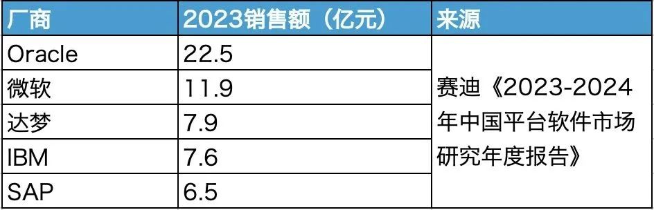 根据赛迪顾问《2023-2024年中国平台软件市场研究年度报告》中销售额看,Oracle和微软这两位国际巨头依然稳居国内数据库市场的头两把交椅,分别是22.5亿和11.9亿。但本土厂商达梦凭借7.9亿元的成绩已经跻身前三。IBM(7.6亿)和SAP(6.5亿)则紧随其后,分别位列第四、第五。虽然达梦与 Oracle、微软的销售额还有很大差距,尤其是Oracle遥遥领先,但在本土厂商中,达梦稳坐第一的位置。