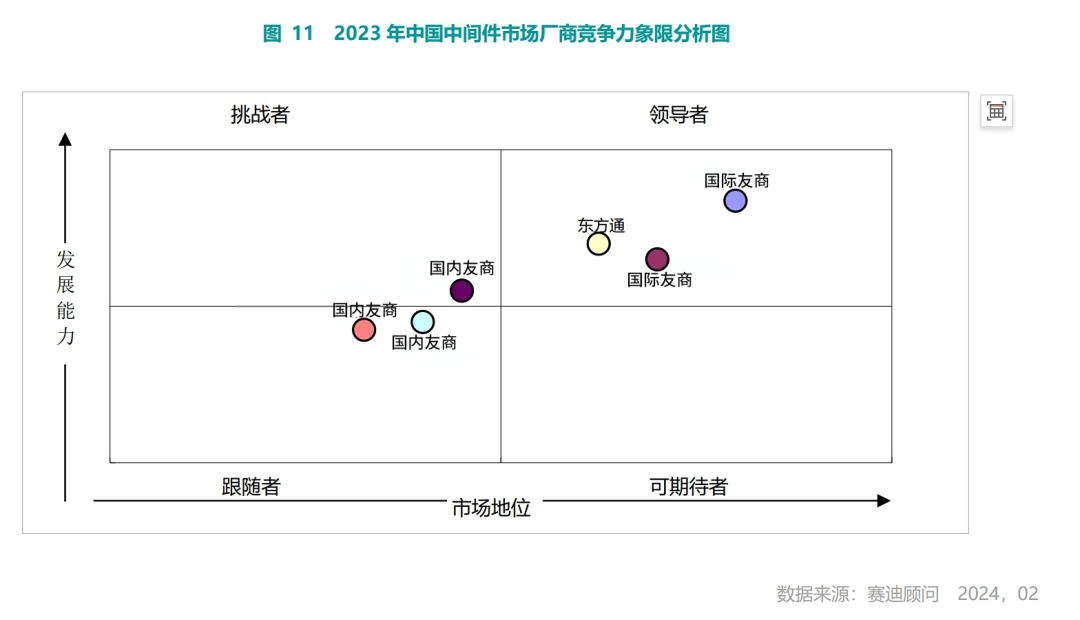 同时赛迪顾问在今年年初发布了《2023-2024 年中国平台软件市场研究年度报告》。该报告对国内平台软件市场格局和发展趋势进行了全面梳理和分析,东方通凭借在中间件据领域的卓越表现,稳居中国中间件市场领导者象限,国产中间件厂商市场份额第一。
