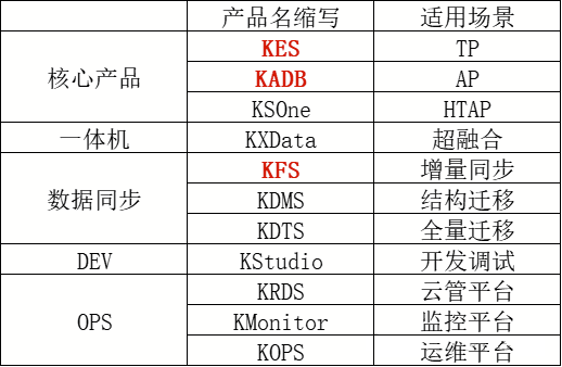 KXData 基于超融合技术,为用户提供一站式数据库解决方案,以其高安全、高可靠、开箱即用、一键部署、智能运维等特点,满足用户多场景需求,大幅降低整体采购成本和运维成本,有效提升了资源利用效率,帮助用户构建了一个极简、稳定、高效的数据库底座。配套工具KFS 金仓异构数据同步软件Kingbase FlySync (KFS) 是面向同城/异地灾备、数据库平滑升级替换、数据集中共享与分发、应用上云迁移、数据库负载均衡等场景的数据同步产品。该产品基于增量日志解析技术,性能高、时延低、资源占用极少,能够实现异构数据源之间大规模增量数据的任意方向流转和实时同步,帮助用户打破数据孤岛,轻松共享分发数据。KFS 支持丰富的软硬件平台和数据源,同步拓扑可以一对一、一对多、多对一、级联等方式任意组合延伸,并可在数据同步过程中保证端到端的事务级数据完整性和高可用性。