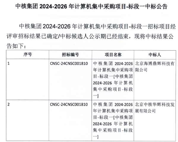 本次中标的2.4万台终端,包含基于飞腾腾锐D2000的台式机、笔记本产品共计2款4类,飞腾也成为该电力央企主要技术路线。虽然未公布具体是哪家央企,但就在近日,中核集团(中国核工业集团有限公司)公布了2024-2026年计算机集中采购项目中标结果公告基本按照5个标段基本可以判断本次飞腾中标。