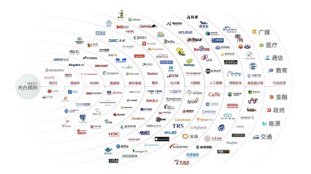 光合组织,通过海光的通用芯片底层,将软硬件厂商们凝聚在一起,构建开放协同的产业生态集群。