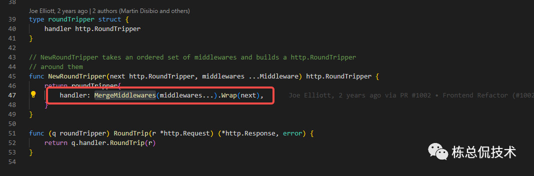 在NewRoundTripper的实现里又看到了熟悉的函数MergeMiddlewares