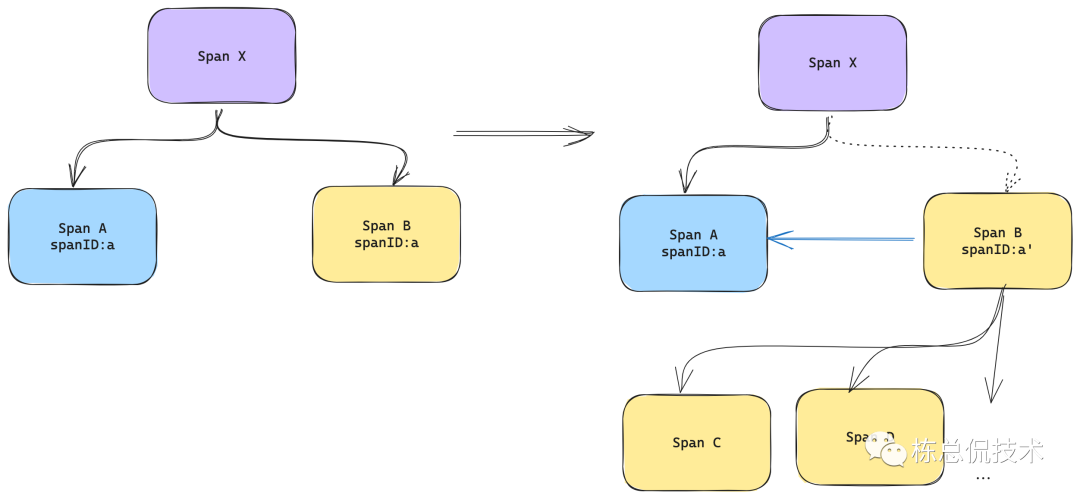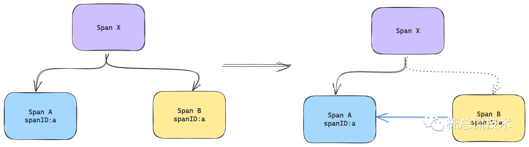 如果某个server类型的Span的SpanID和一个client类型的Span的SpanID相同,说明这个span跨越了前后端,需要将这两个span区分开(不然在显示上会将分别属于前后端的两个span显示在一起)。