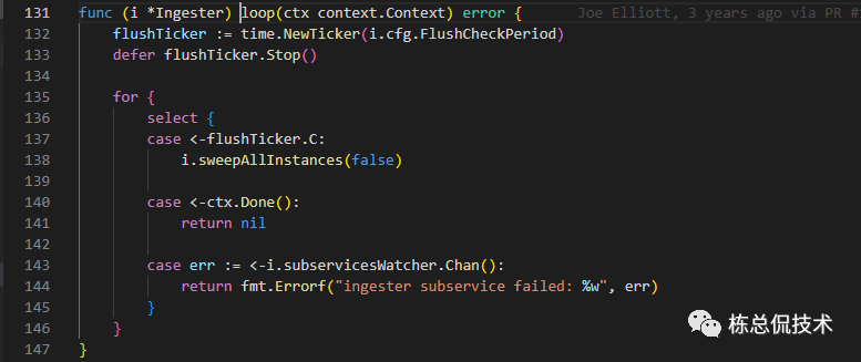 在程序启动,初始化Ingester对象时将会注册loop方法至service(在前面章节中接收了service被serviceManager管理生命周期)