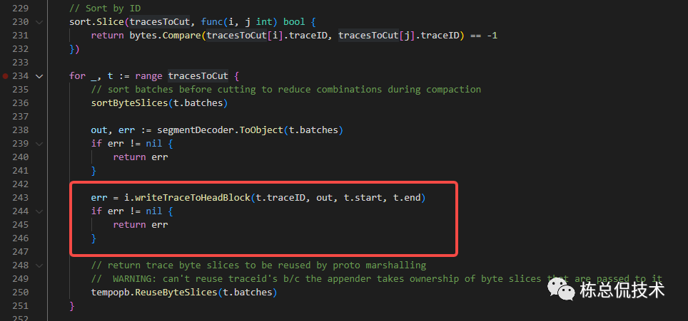 将获取的需要裁剪的LiveTrace数据按照TraceID排序后,将trace结构按照指定的编码格式转化为[]byte,并写入headblock(注意这是Trace进入Ingester的第一个中间产物)
