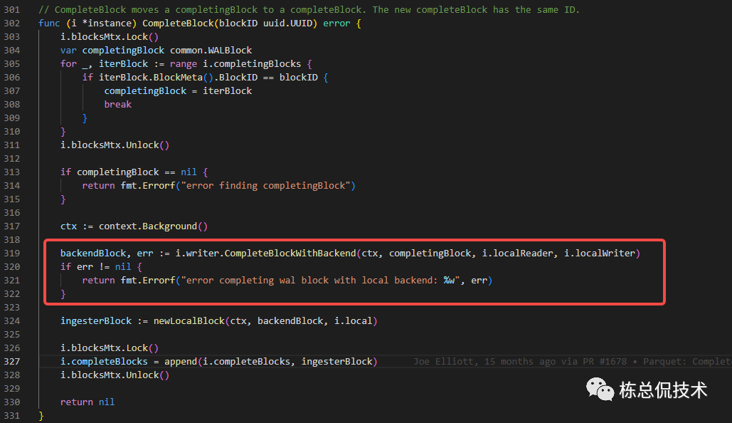 handleComplete是将数据写入tempodb的过程。写入成功后将compltingBlocks转化为completeBlocks。