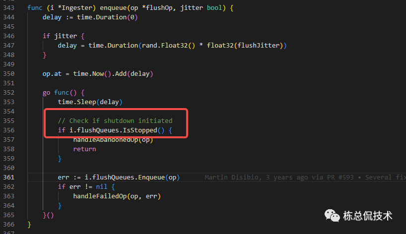 在Enqueue中,会等待10秒钟首先判断处理下一步任务的flushQueues是否已经停止