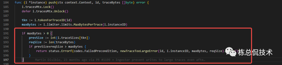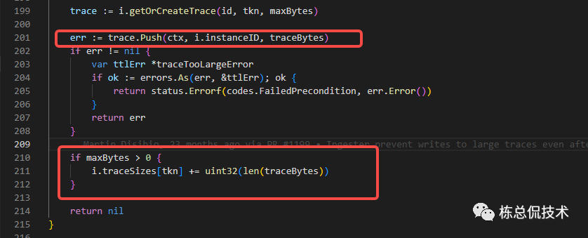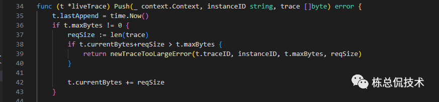 在liveTrace.Push(ctx, i.instanceID, traceBytes)方法中,累加之前接收的span大小,再次判断Trace当前的总包大小是否超过最大支持。