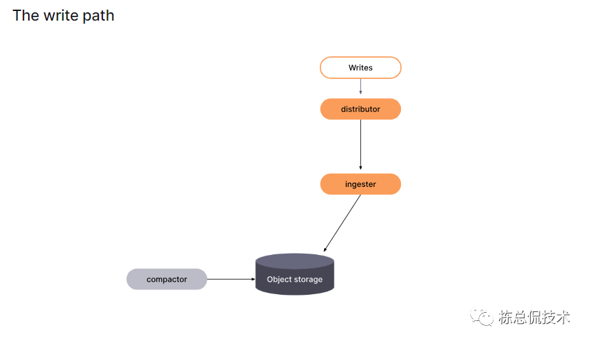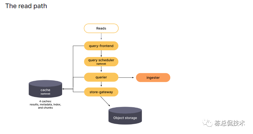 Mimir指标写入的组件与Tempo、Loki均类似,由distributor介绍指标,然后传递给Ingester与存储交互,完成持久化存储。