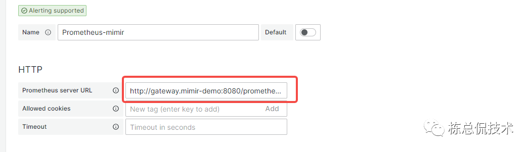 在Grafana的数据源管理页面选择新增Prometheus类型数据源,配置mimir的查询地址: