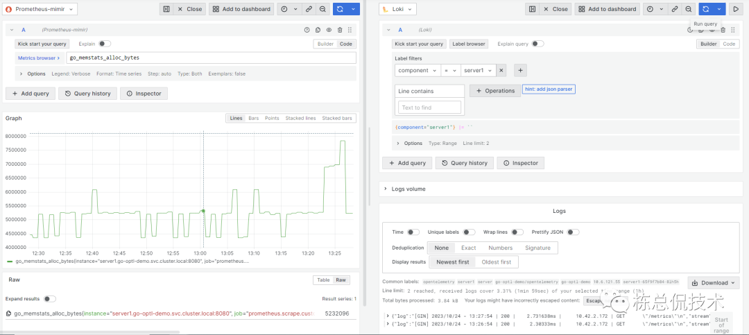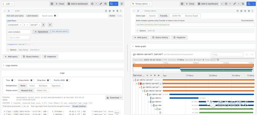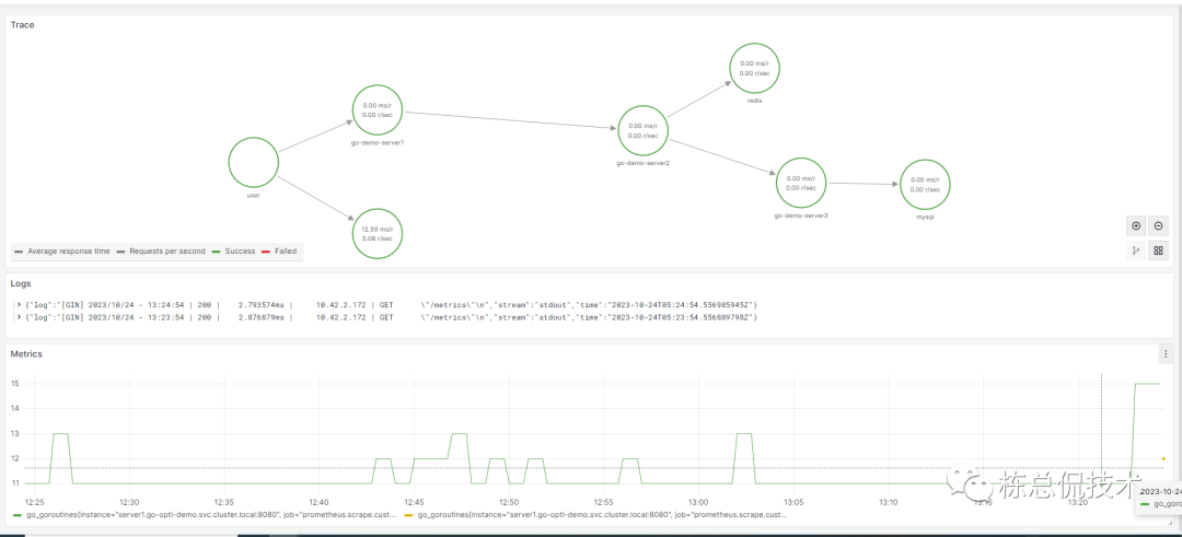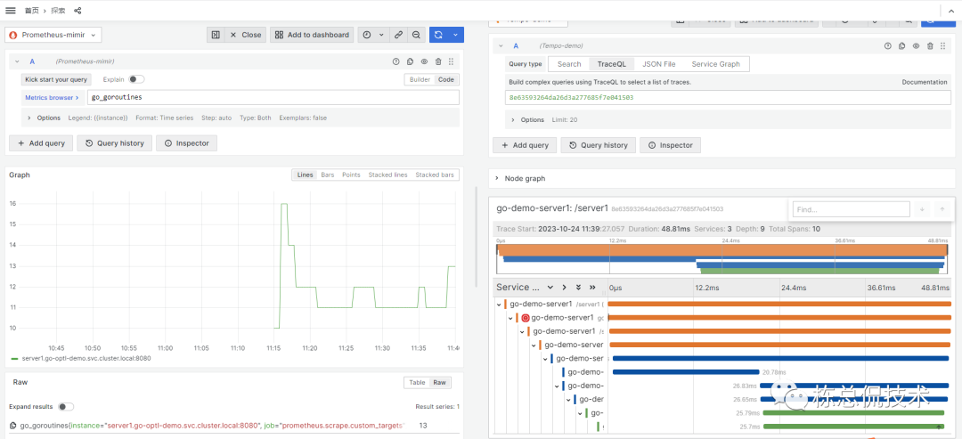 到这里我们我们完成了Grafana生态的Agent、Tempo、Loki、Mimir部署,能够在Grafana一个平台上整合Trace、Logs、Metrics的查看。