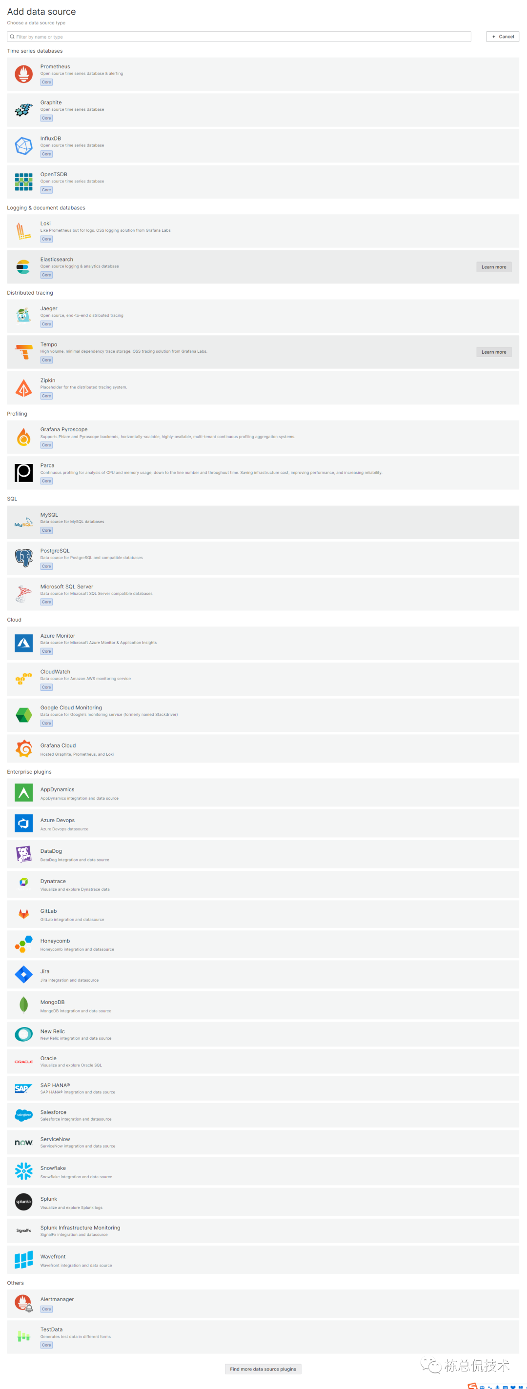 Grafana支持丰富的数据源,内置支持的数据源类型包括: