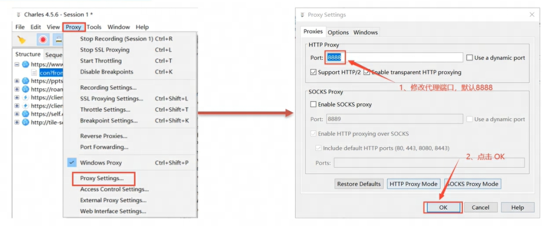 第一步,在菜单栏勾选Proxy -> Windows Proxy,系统HTTP/HTTPS代理将会被自动设置为本地代理,默认端口8888,可在Proxy Settings中修改端口。