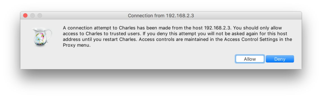 在iOS设备上访问数据链接,Charles 弹出 Access Control 确认对话框,选择Allow,可以开始抓取HTTP包。