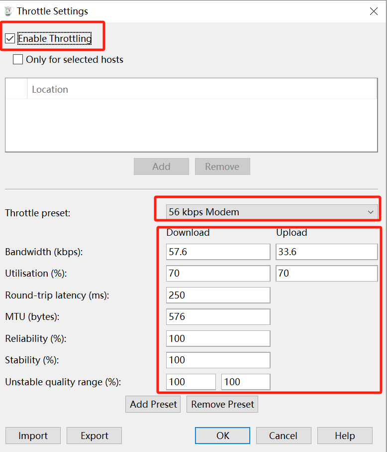 设置好各项数值,点击 Add Preset ,填写 Preset 的名称,点击OK ,即可保存自定义网络预设成功,之后就可以在Throttle preset 的下拉选项中找到自定义的网络设置。