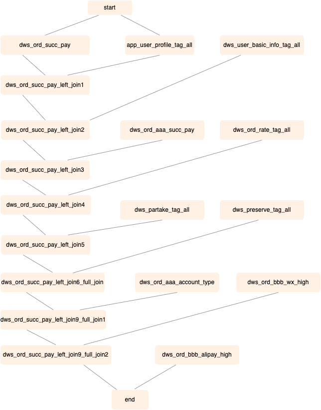 了解数据整体链路后,我们针对具体离线任务进行血缘关系分析。下图所示为用户标签实际业务场景的血缘关系图,从中可以看到数据来源的多样性、数据的可追溯性和数据的层次结构。一个任务调度流从start到end经过了多层数据流转,即存在多层血缘关系。借助血缘关系图,并结合业务逻辑来分析数据转换前后的数据量和数据值的一致性。