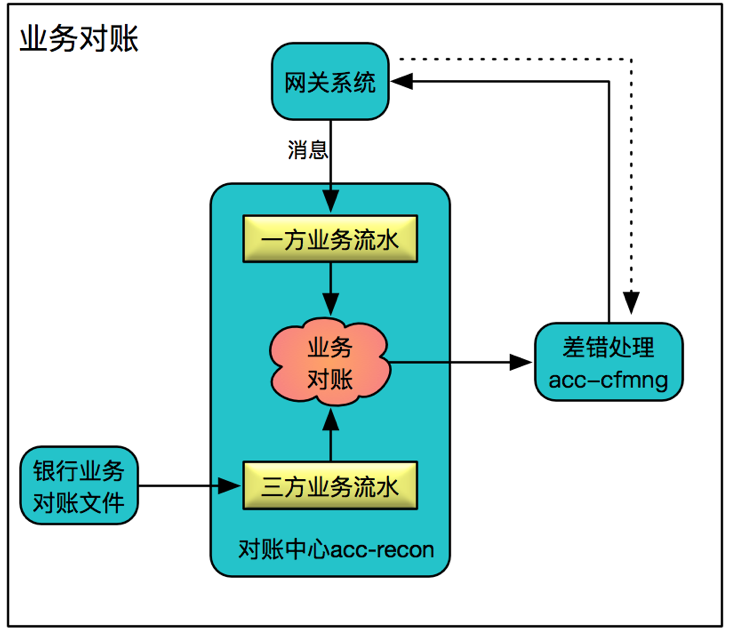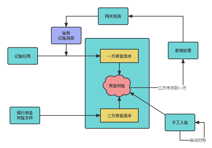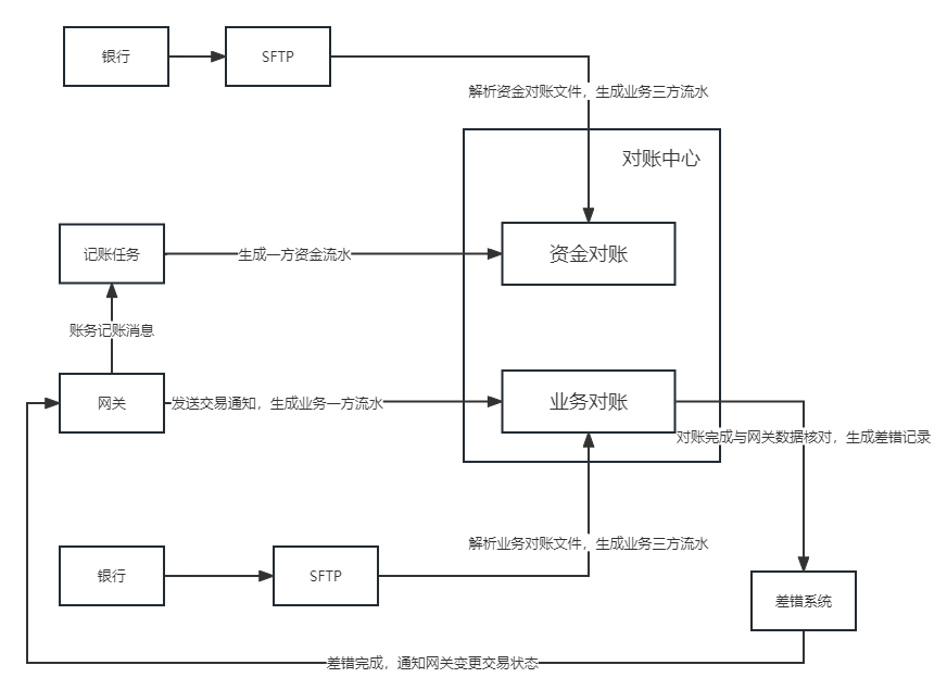 资金对账:根据银行的资金对账文件,与账务系统的资金明细进行逐笔勾兑,用以明确在某一个结算周期内,由业务产生结果的债务关系的清偿约定。同时也是后续会计核心系统做相关处理的前置工作。