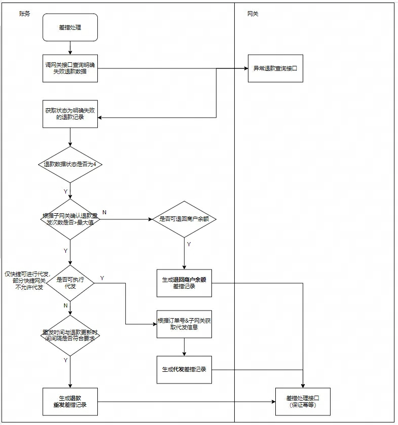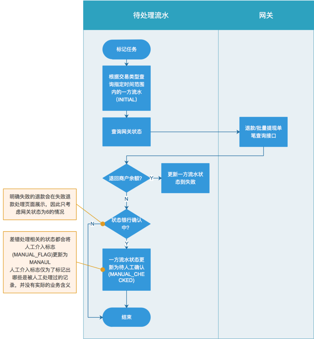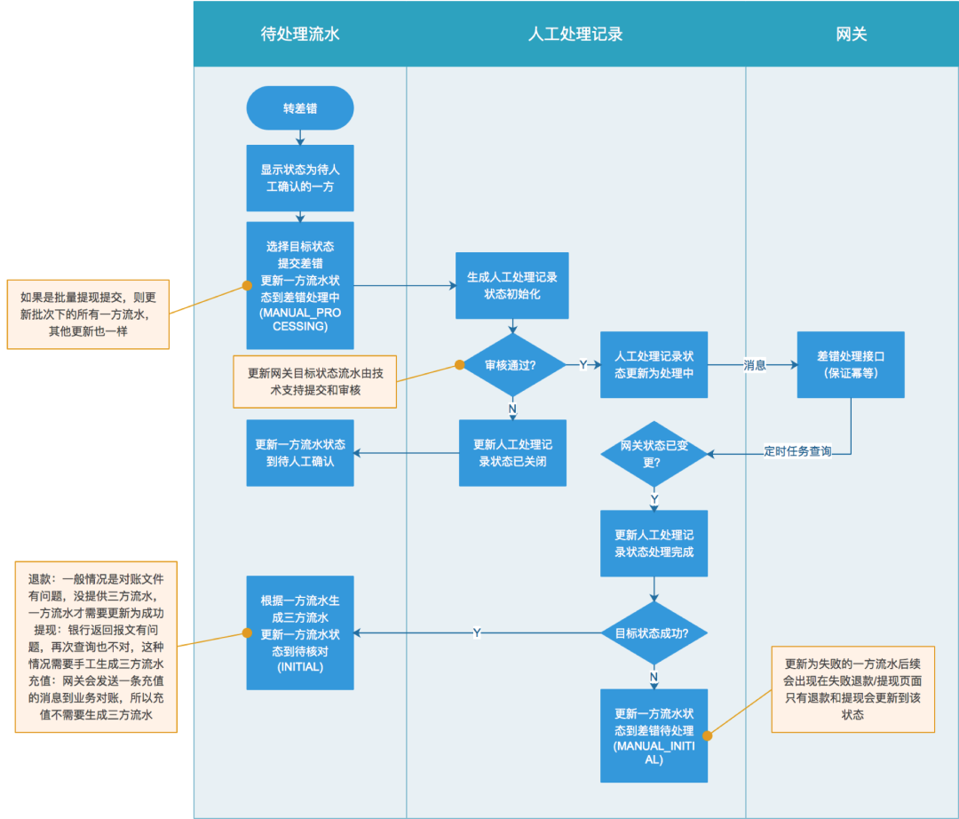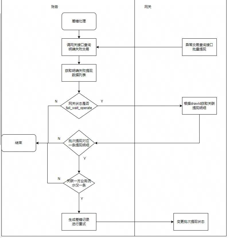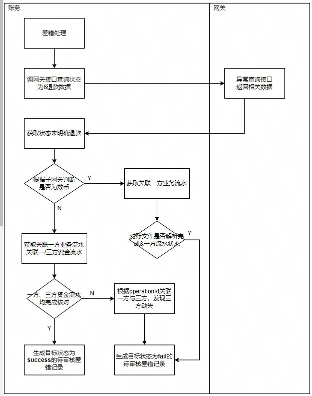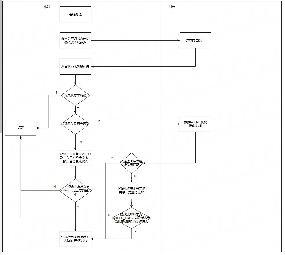 根据网关查询结果,依据不同提现网关做不同逻辑判断,生成待审核差错记录,待人工确认后调网关接口调整对应提现数据状态。