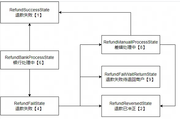 网关退款订单状态流转较为复杂,下图仅列出了差错功能涉及的几个状态流转关系。