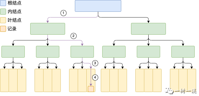 上图是一棵高为 4 的 B+ 树示意图,定位索引叶子结点记录,需要从根结点开始,经过内结点、叶结点,最后定位到记录,路径为:① -> ② -> ③ -> ④