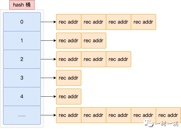 橙色块表示记录地址组成的链表,因为多条记录可能被映射到 hash 桶中的同一个位置。