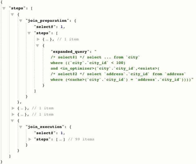 通过 optimizer trace 也可以验证主查询每读取一条满足 city_id < 100 的记录,EXISTS 子查询都要执行一次,如下: