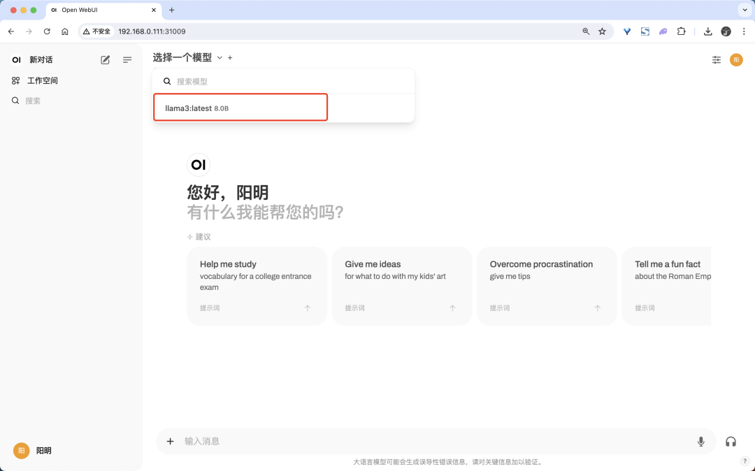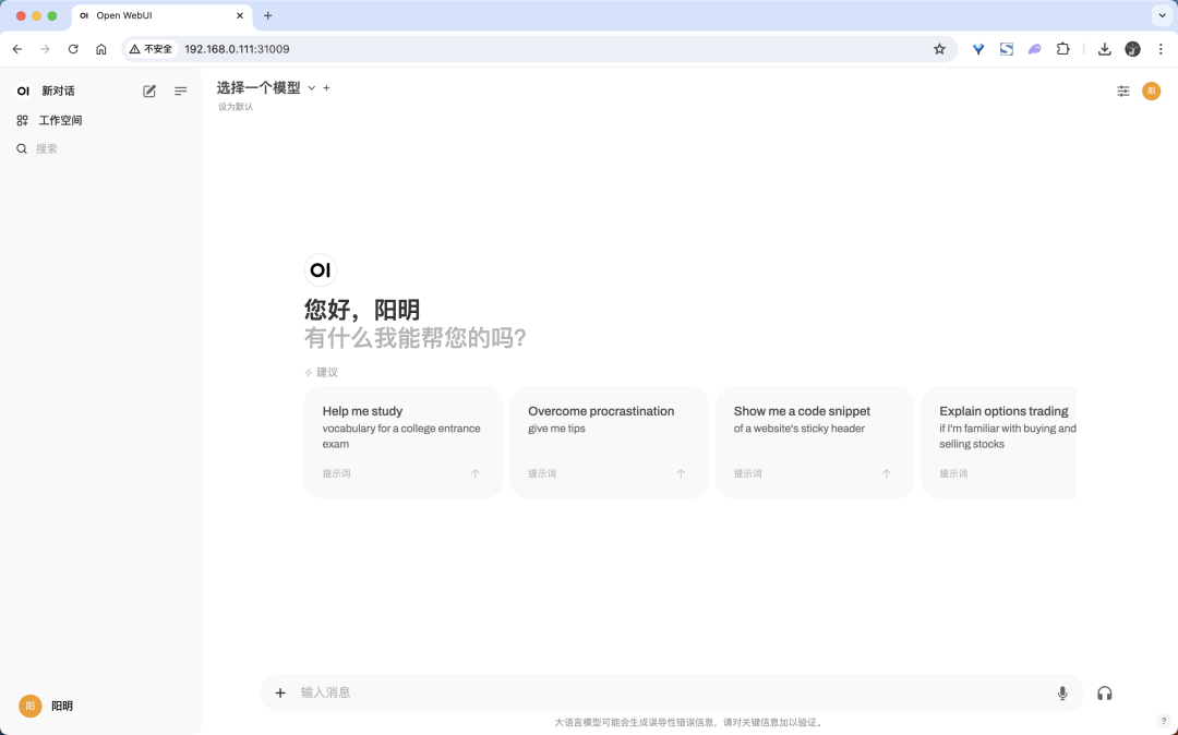 第一次使用的时候需要注册一个账号,然后我们就可以登录到 Open-WebUI 项目主页了。