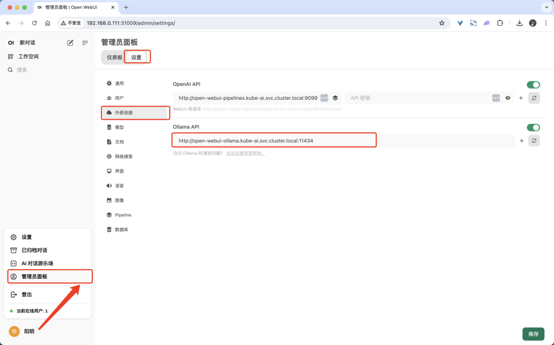 类型的 Service,所以我们可以通过 Node 的 IP 和 NodePort 来访问 Open-WebUI 项目:
