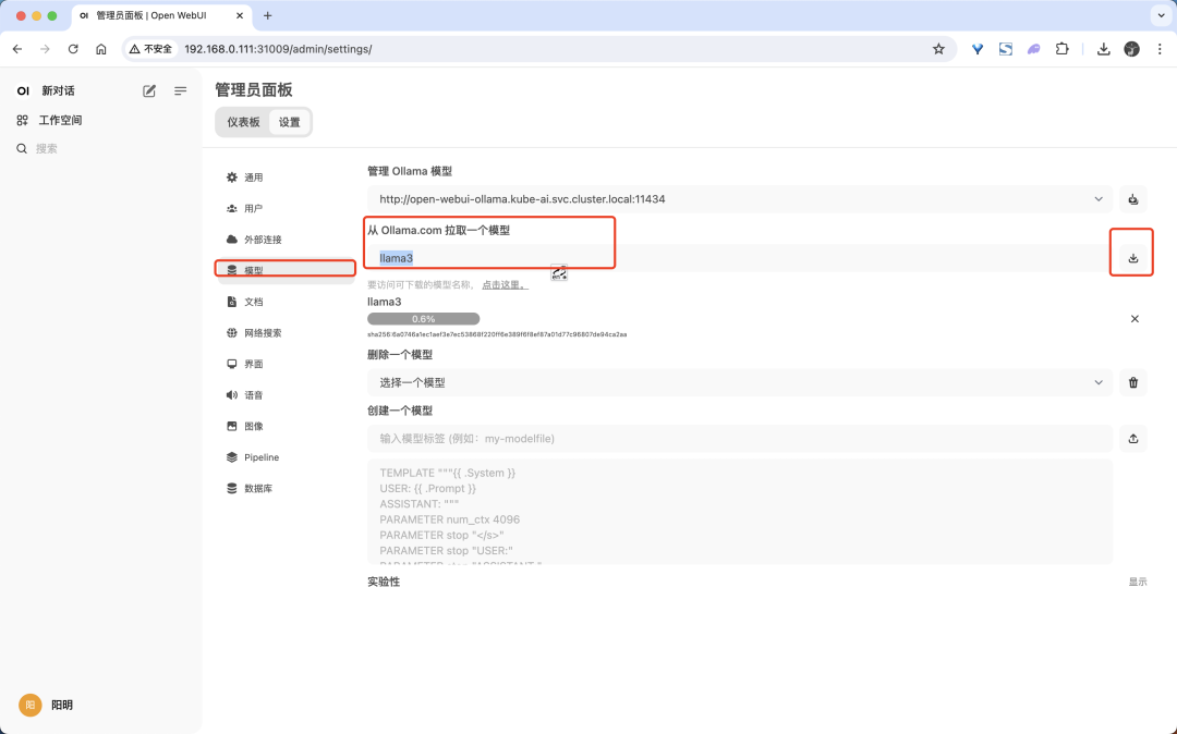 然后点击右侧的拉取下载按钮,就会开始下载这个模型了,在页面中也可以看到下载的进度。