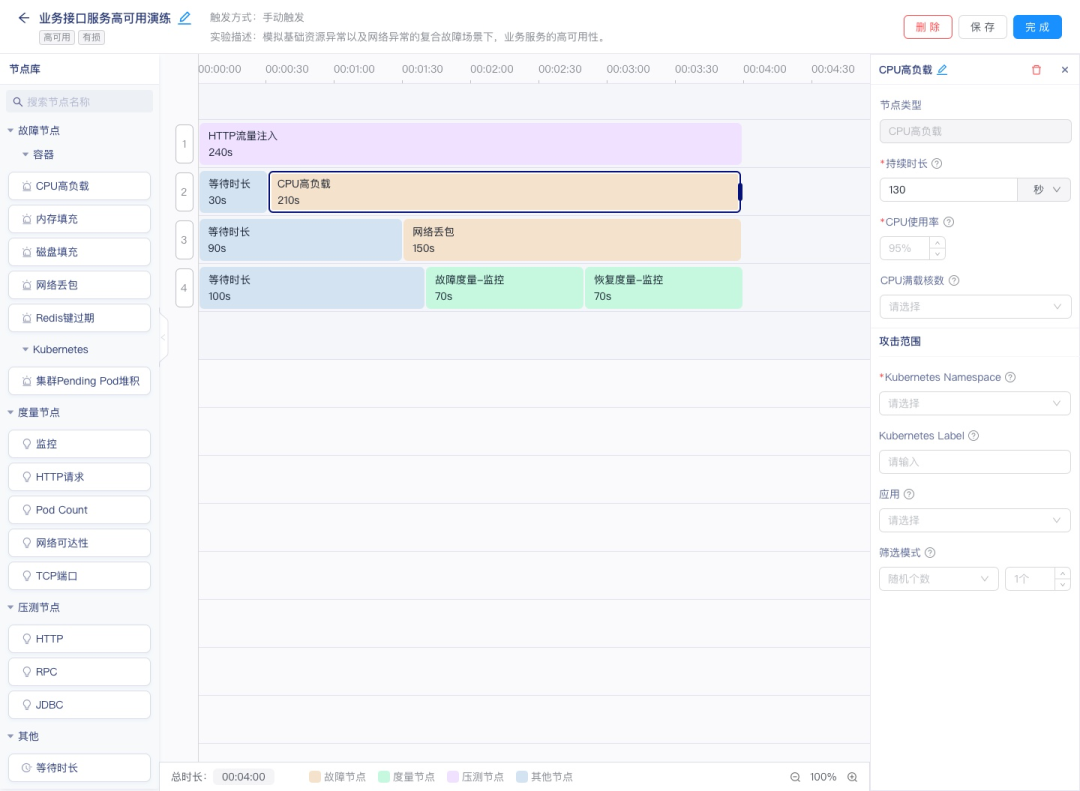 提供实验编排能力,降低使用门槛(当前版本的界面暂未支持流量注入类型和度量类型节点); 提供对集群内的 Pod/Node 远程目标注入能力以及筛选能力(后续会在界面支持集群外的目标); 提供空间管理的能力,可以对数据按需分隔管理; 提供账号权限管理系统。