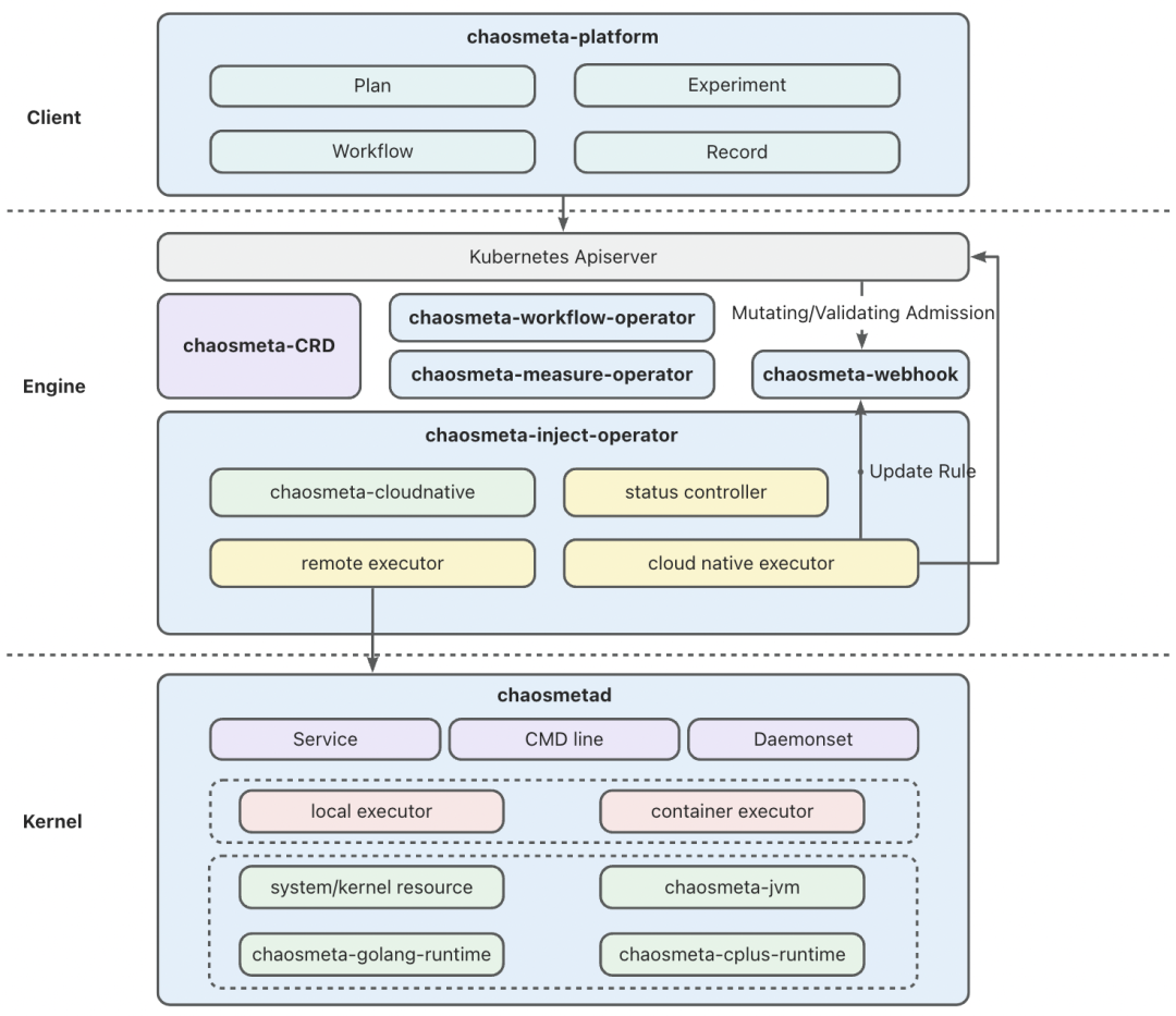 chaosmeta-CRD:ChaosMeta 的平台能力都是基于 Operator 框架开发的,因此每类能力都有对应的CRD,然后由对应的 Operator监听状态并执行对应操作。比如故障注入能力的 CRD 为 experiments.inject.chaosmeta.io 而对应监听的 operator 为 chaosmeta-inject-operator。因此用户可以通过 Kubectl 或者 Kubernetes-Client 创建对应的 CR 实例以执行相应的功能;