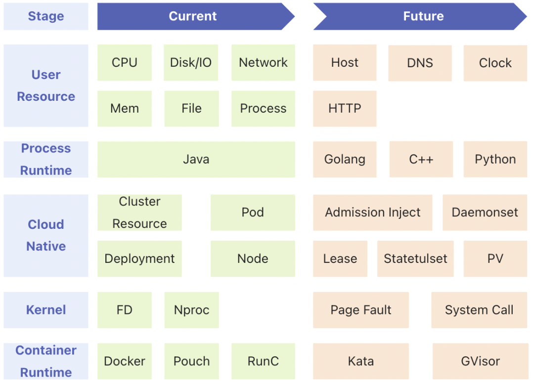 系统资源异常:CPU、内存、网络、磁盘、进程、文件等; 内核资源异常:fd、nproc等; JVM动态注入:函数调用延迟、函数返回值篡改、函数抛出异常等; 容器故障注入:杀容器、暂停容器,容器内CPU、内存、网络、磁盘、进程、文件、JVM注入等实验场景; Kubernetes注入:对任意pod执行CPU、内存、网络、磁盘、进程、文件、JVM注入等实验场景; 云原生故障:集群资源异常比如大量Pending Pod堆积、Completed Job堆积等;还有Deployment、Node、Pod等云原生资源实例异常比如Deployment实例副本扩缩容篡改、Pod实例Finalizer注入等。