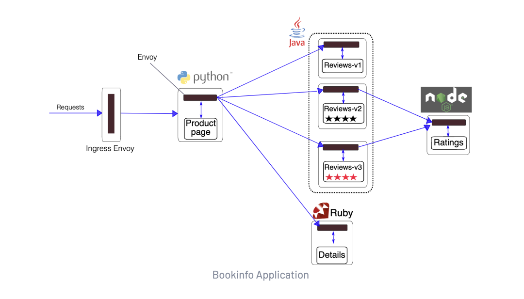 示例包含四个独立的微服务,每个微服务都有多个版本。其中 reviews