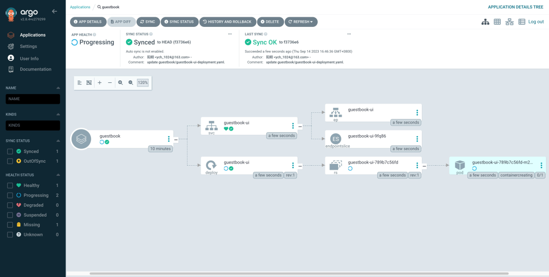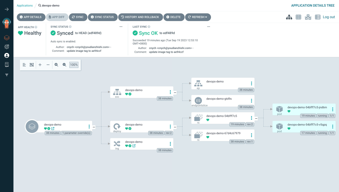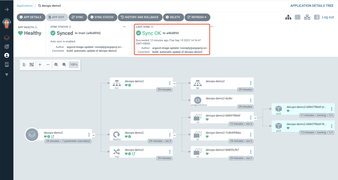 自动提交变更后,Argo CD 就会自动同步部署应用了。