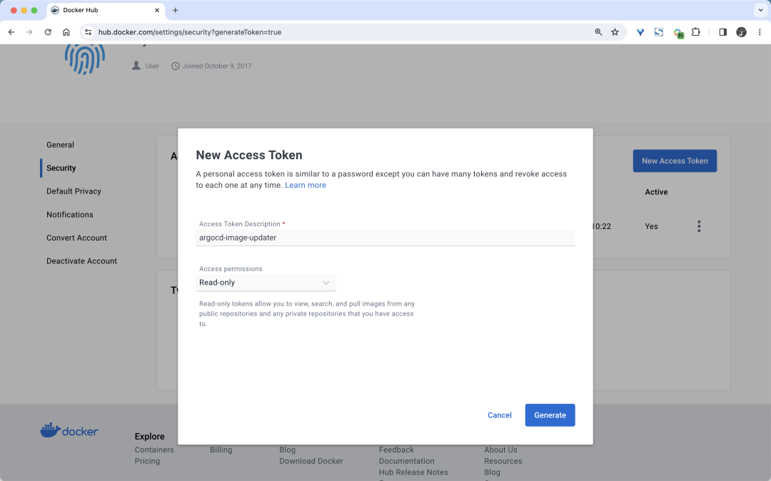 的注解,如果使用的是 docker hub,需要在个人中心去创建一个 access token: