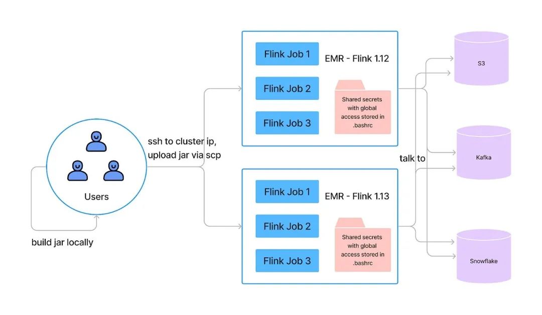 当我们开始使用 Flink 作为流式计算引擎时,我们在 AWS EMR 集群上部署了所有的 Flink 作业。在 EMR 集群上运行 Flink 是一个很好的起点,因为 EMR 集群默认带有 Flink 和 Hadoop 等大数据框架。在过去的 10 个月里,我们接入了超过 50 个产品团队运行他们的 Flink 管道。在数据基础设施团队内部,我们增加了 500 个 Flink 数据摄取管道。为了满足高需求,我们需要将作业所有权委托给产品团队,并使我们的平台可以自助。然而在 EMR 上运行 Flink 无法满足如此高的需求,此外,缺乏原生工具使 Flink 在 EMR 上的自助运行变得困难。