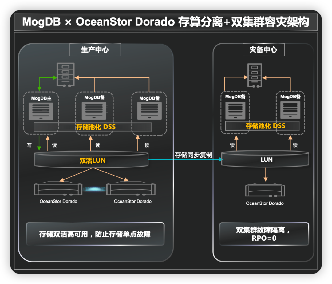 在生产应用方面,MogDB 与 OceanStor Dorado相结合,通过在生产中心使用存储双活确保了数据库集群的高可用,即使在单点存储故障的情况下,业务也能不受任何影响。此外,在生产中心和灾备中心应用的数据库双集群容灾技术,使得当数据中心级灾难发生时,可实现双集群RPO=0的跨数据库中心容灾,RTO小于60秒也极大地缩短了业务中断的时间,提高了业务连续性,为行业用户提供了一个更加可靠的数据保护机制。